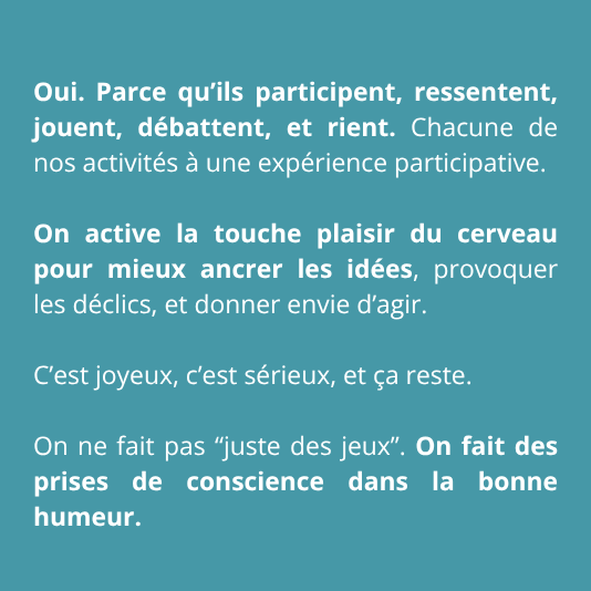 Chez Label Équipée, on ne cloisonne pas : sensibiliser, c’est déjà rassembler. Nos formats mêlent jeu, émotion et collectif pour faire de chaque moment un levier d’engagement.